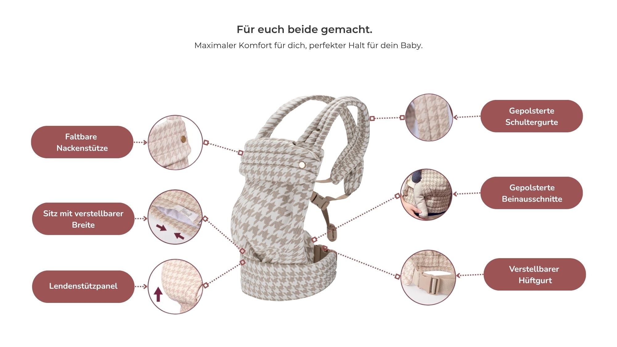 Sie unterstützt die „M-Position“, die der physiologischen und geborgenen Haltung beim Tragen entspricht und deinem Baby Komfort und Halt bietet.